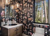 Whimsical powder room wallpaper features various playful forest critters; the lights are from Homestyles Lighting in Dalton Gardens.