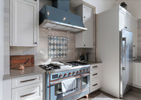 The kitchen’s Moroccan-inspired backsplash tiles complement an Italian ILVE range with copper trim, while the dreamy blue hue of the fireplace wall was “a happy accident,” says designer Shannon Richardson.